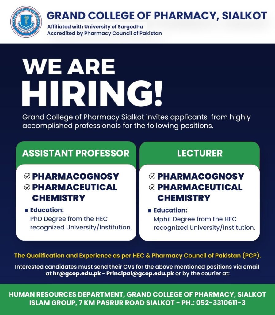 The Islam Group (IG), with its heritage of excellence in higher education for more than a decade, launched Grand College of Pharmacy in 2023. GCOP is an approved institute by the Pharmacy Council of Pakistan under notification number F.No.2-149/2022-PCP (F.NO.1-25/2023-PCP) and is affiliated with the University of Sargodha.